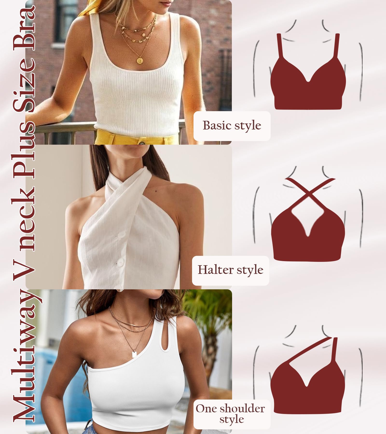 - Multi-ways Wearing: V-neck with multiway strap for versatile essential, offer various styles and outfits. This evryday bra can be worn by tradition way, halter neck or a crisscross back for wedding, party, dating and prom.