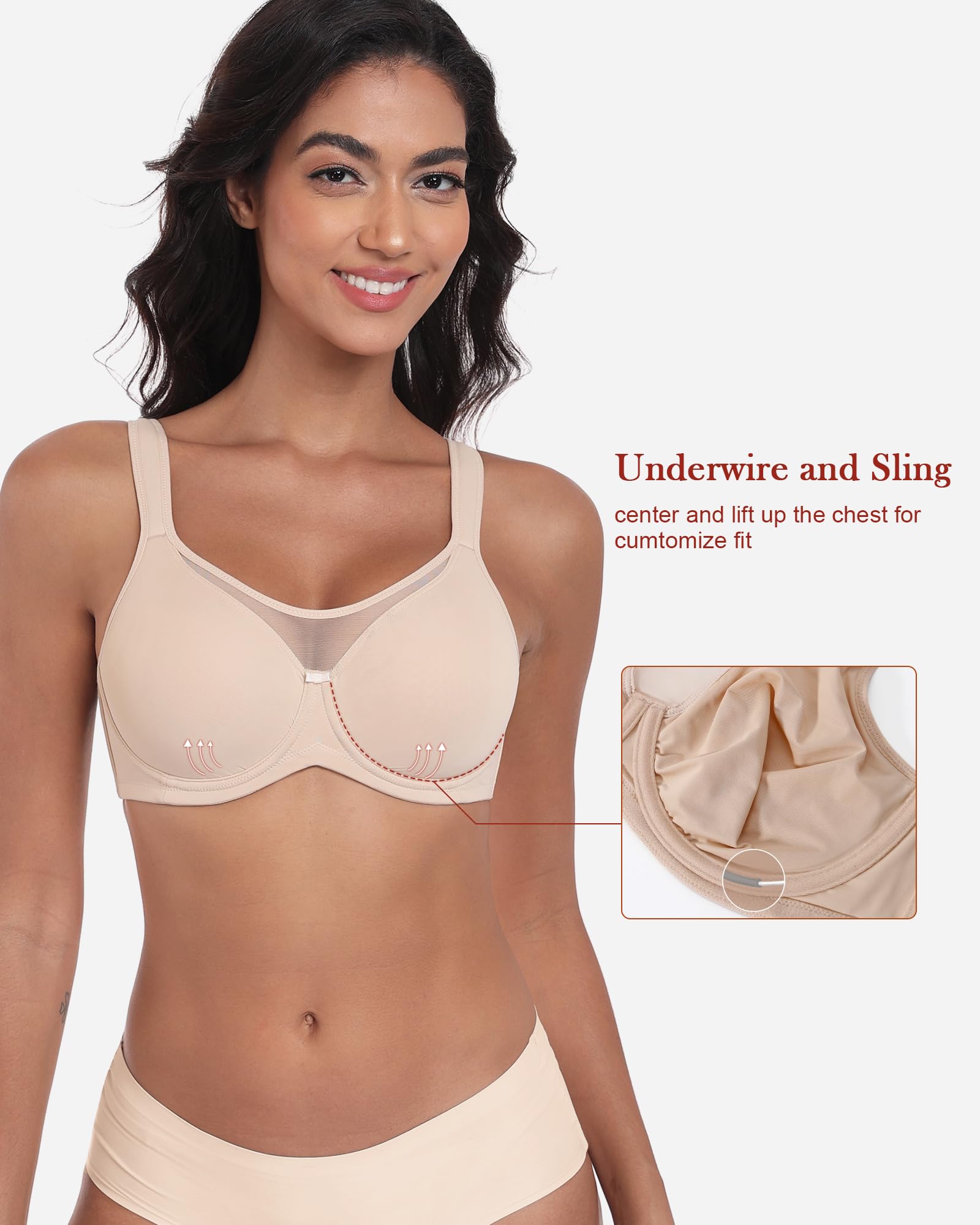 - Friendly for Pluse Size Lady: Featuring a sheer mesh front neckline, this minnimizer bra is designed for security and comfort. It minimizes breast bounce, enhances chest stability, and prevents spillage. Delicate gathering at the center front cup, increase cup capacity, support a lifted, gathered chest silhouette. With cushioned straps, ease shoulder pressure, it delivers superior support and comfort for large busts.