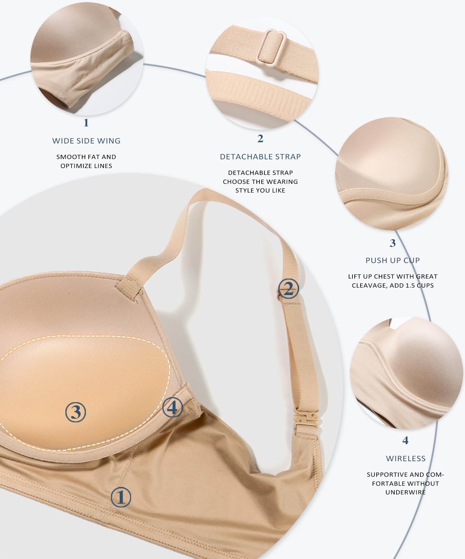 - Push Up: Padded push up cup with longline style, uplift and gathering the chest without underwire, smooth side and back fat. Add 2 cup size at least!
